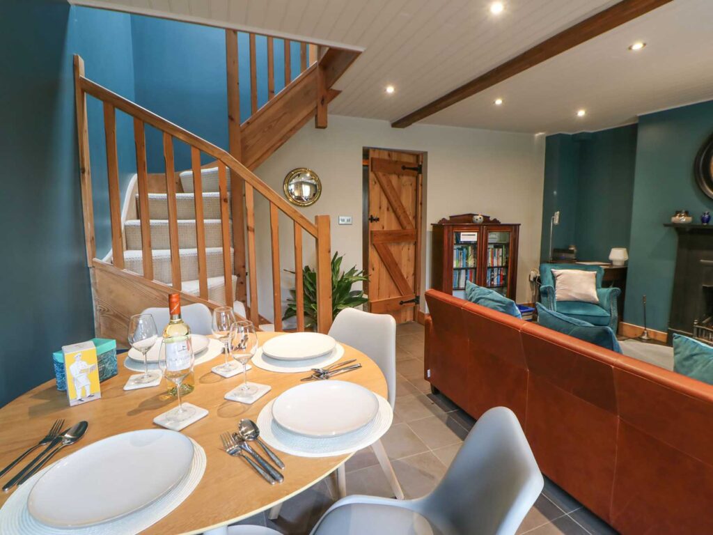 Take in your quaint surroundings before heading inside through the enclosed front patio, before stepping into the lovely sitting room, where an open fire sits before a contemporary selection of soft seating, with a Smart TV with a BT package to entertain.