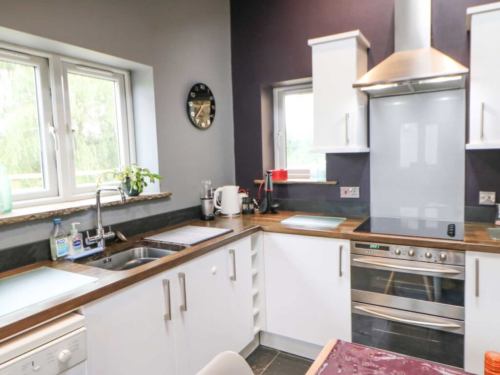 While a bottle of wine is opened around the dining table, watch as the food simmers on the electric hob with an electric oven, fridge/freezer and dishwasher among the rest of the appliances at your fingertips.