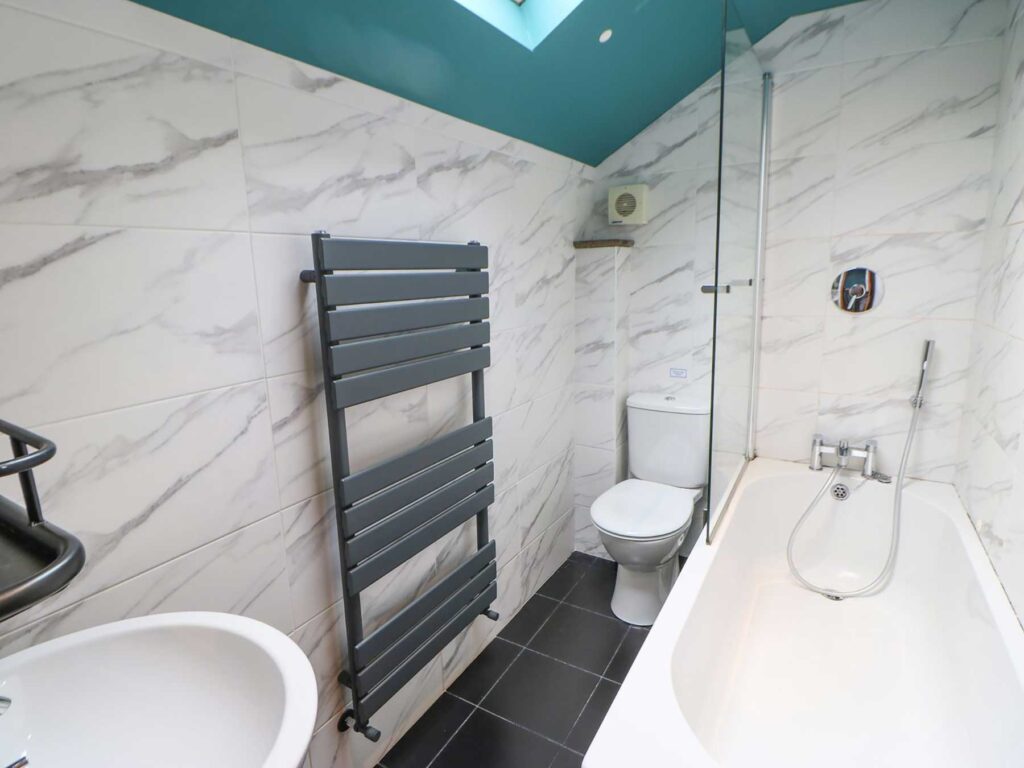 Travel up the stairs to find a second bedroom with a king-size bed, as well as an armchair here for you to curl up in with a book for a quiet moment.Freshen up in the elegant bathroom with marble-effect tiles surrounding the bath with a shower over, enjoy a hot shower before grabbing your towel nicely warmed by the heated towel rail in here.